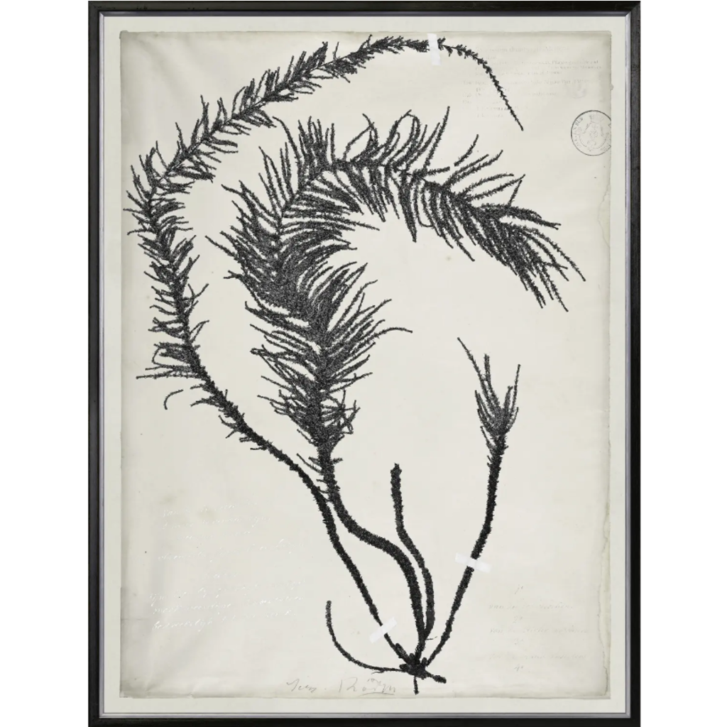 A series of nine botanical seaweed pressings in dramatic black ink against an ivory and taupe ground.